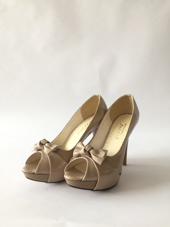 Beżowe lakierowane , wysokie szpilki na platfornie z ozdobną kokardką i odkrytym palcem ekoskóra - MODA SANOK