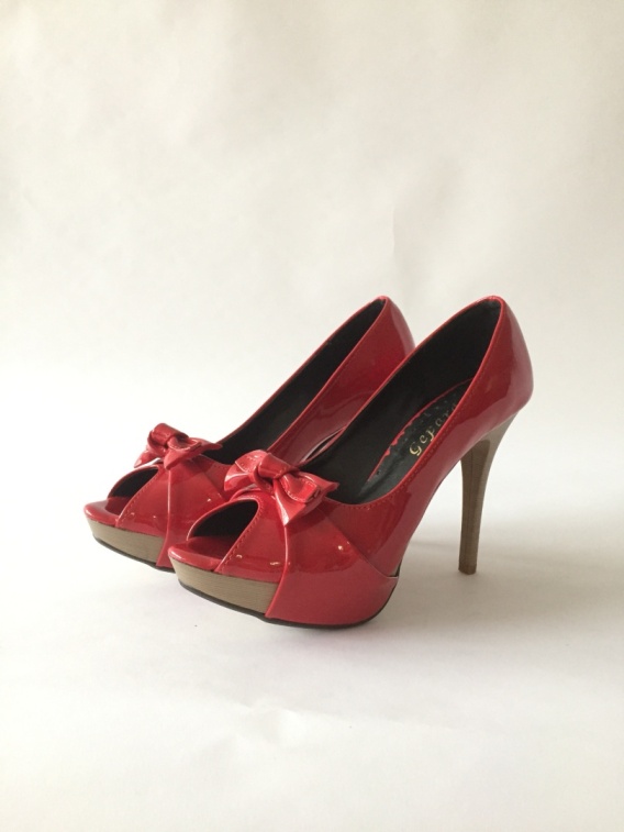 • Czerwone lakierowane , wysokie szpilki na platfornie z ozdobną kokardką i odkrytym palcem ekoskóra - MODA SANOK