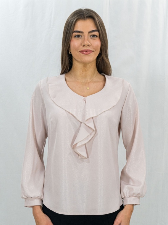 Model posiada dekolt w kształcie litery V, ozdobiony fantazyjną falbaną, która dodaje kobiecego uroku i miękko układa się na sylwetce. Długie rękawy zakończone są eleganckimi mankietami z subtelnym marszczeniem, tworząc harmonijny i stylowy wygląd.