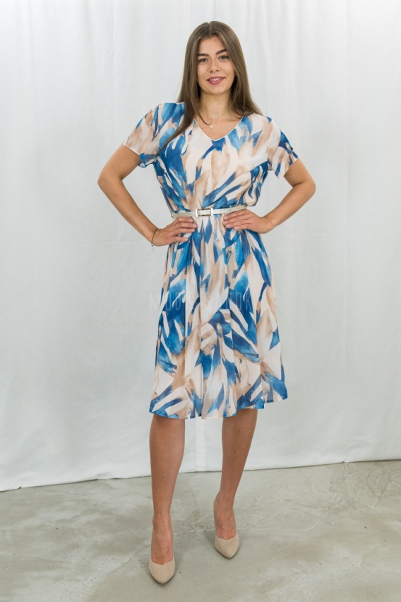 Elegancka wizytowa rozkloszowana kobieca sukienka za kolano, krótki rękaw z dekolem w literkę V NELLA- MODA SANOK