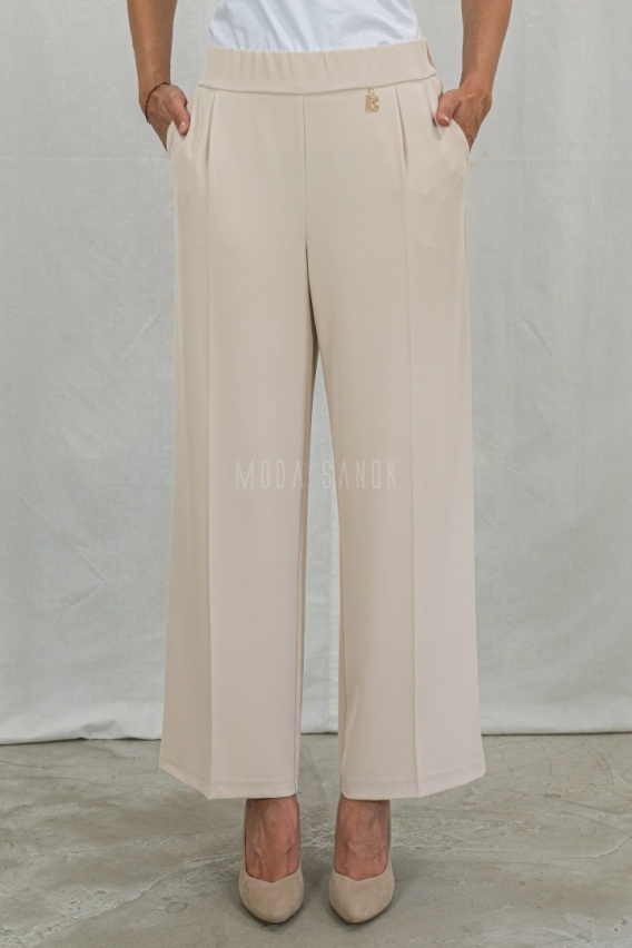 Eleganckie spodnie w kolorze jasnego beżu o prostym fasonie z szerokimi nogawkami to bardzo kobieca i odważna propozycja.To doskonały wybór jeżeli lubisz wygodny styl z eleganckim akcentem. Są wyjątkowo komfortowe w noszeniu i doskonale dopasowują się do sylwetki. Wykonane z lejącego cienkiego materiału. Posiadają w pasie szeroką gumkę,co doskonale podkreśla talię,a po bokach wpuszczane kieszenie.Optycznie wyszczuplają sylwetkę i wydłużają nogi. Doskonałe na każdą okazję.