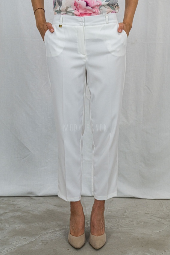 Biała kolorystyka dodaje lekkości i uniwersalności – doskonale sprawdzą się zarówno w formalnych stylizacjach, jak i w codziennych zestawach. Posiadają pas zapinany na dwa guziczki, z tyłu elastyczna gumka która gwarantuje wygodne dopasowanie, a dwie wpuszczane kieszenie po bokach dodają praktycznego charakteru bez zaburzania eleganckiego fasonu.