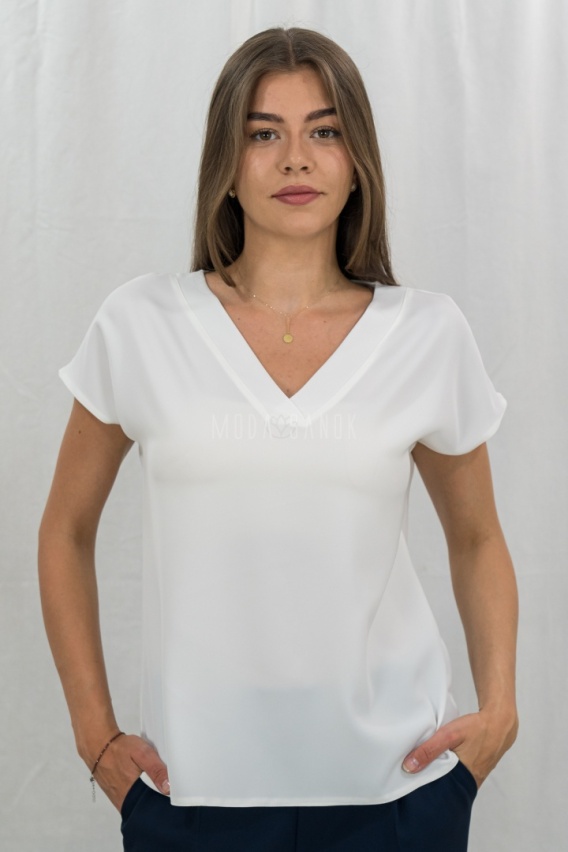 • Jednokolorowa biała klasyczna, elegancka bluzka damska z krótkim rękawem oraz dekoltem w serek MADEX - MODA SANOK