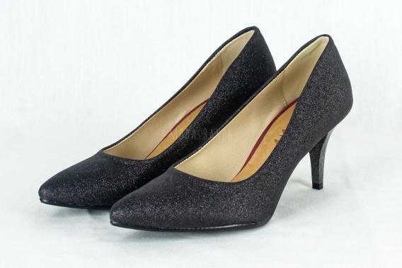 • Klasyczne czarne czółenka szpilki na niskim obcasie z brokatowym połyskiem FOR-BUT-MODA SANOK