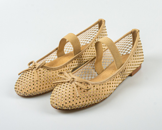 Siateczkowe balerinki damskie w kolorze beżowym z gumką i cyrkoniami GOODIN - MODA SANOK