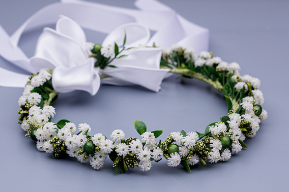 • Wianek komunijny z białej gipsówki i zielonymi dodatkami oraz z satynową kokardą MODA SANOK