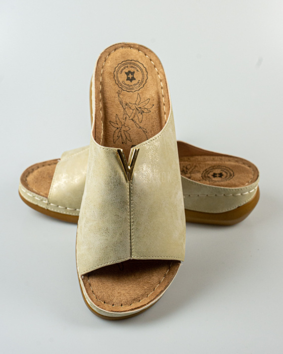 Eleganckie damskie klapki Evento na koturnie – złote, komfortowe, stylowe